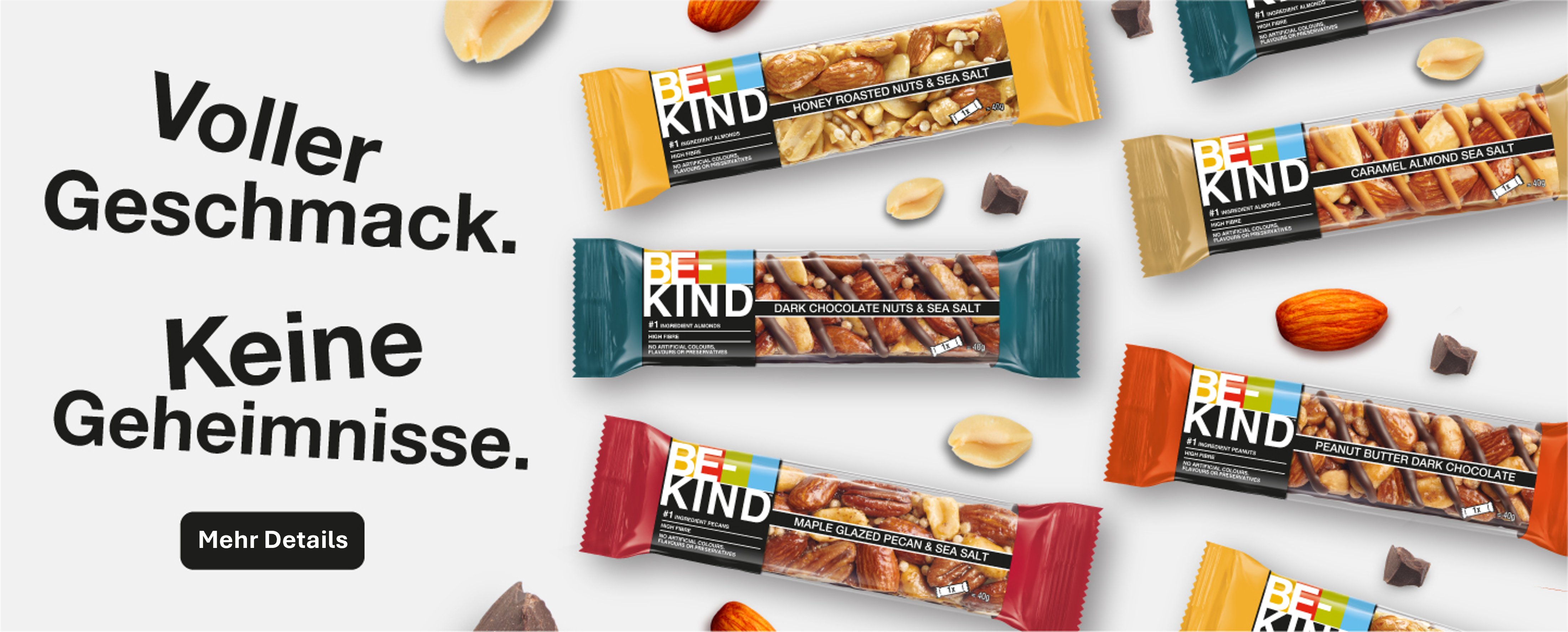 und wir produzieren leckere und nährstoffreiche Riegel. Sie sind voller Geschmack und ohne versteckte Zutaten. Egal, ob du Snackriegel, Müsliriegel, glutenfreie Alternativen oder Proteinriegel suchst – bei uns findest du genau das Richtige. Unsere Riegel sind perfekt als praktischer Snack für unterwegs. Unter der großen Auswahl an Geschmacksrichtungen ist bestimmt auch der passende Riegel für dich dabei. Genieße noch heute einen BE-KIND Riegel!